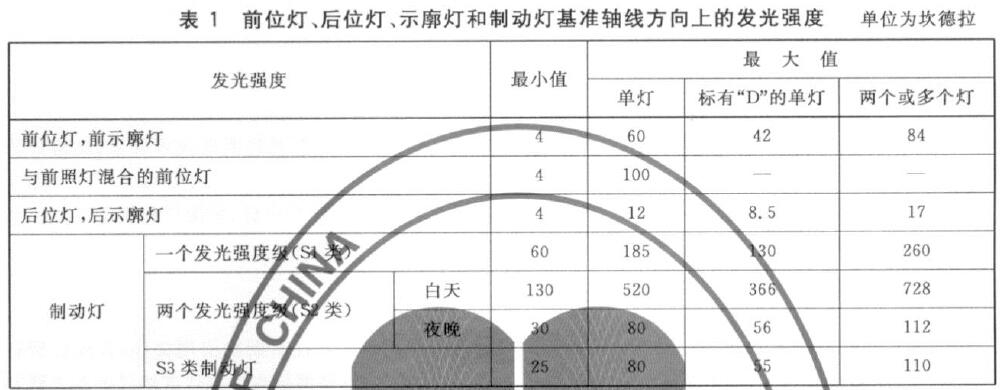 2.3.1前位灯、后位灯、示廓灯和制动灯,在基准轴线方向上的发光强度应符合表1规定。